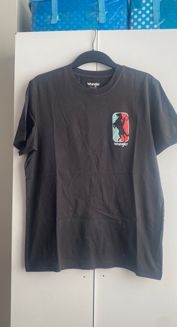 Wrangler marka, antresit baskılı, kısa kollu, yuvarlak yaka erkek tişört. Yumuşak ve sıcak kumaştan, rahat kesim, günlük dış mekan kullanımı için uygundur.