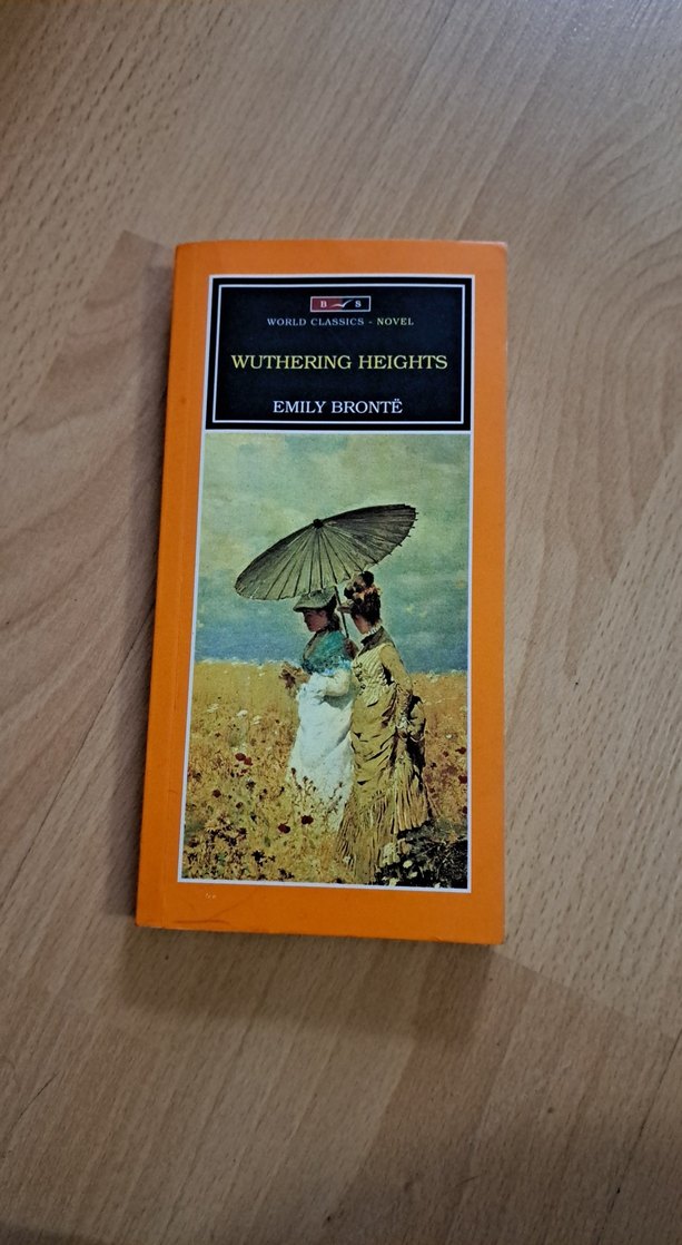 Emily Brontë'nin Wuthering Heights adlı klasik romanı, turuncu kapak üzerinde iki kadının şemsiye taşıdığı bir sahne ile dikkat çekiyor.