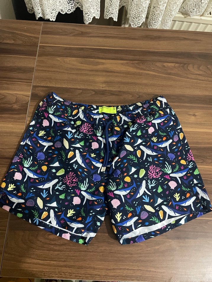 Gevşek kesim, deniz temalı renkli baskılı erkek mini şort. Plaj ve sokak stiline uygun kısa boy.