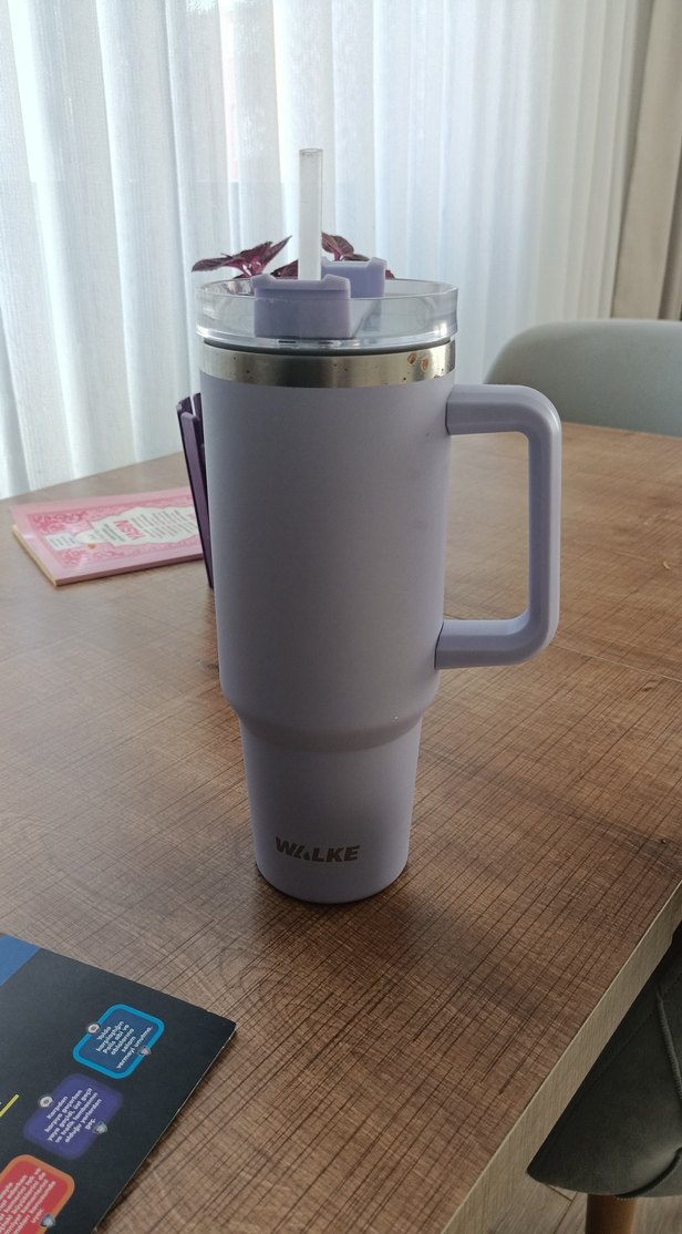 WZ.LKE logosuna sahip, kulplu ve şeffaf kapaklı mor renkli termoslu seyahat kupası. İçeceği sıcak veya soğuk tutar. ☕