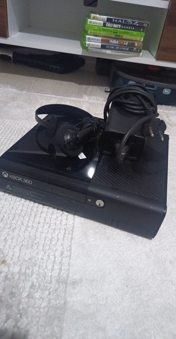 Xbox 360 oyun konsolu, güç adaptörü ve kulaklık ile birlikte. Klasik siyah tasarım, oyun keyfi için.
