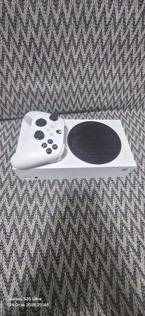 Xbox Series S oyun konsolu, kablosuz kumanda ile birlikte gelir. Üstte büyük siyah havalandırma ızgarası bulunan kompakt tasarıma sahiptir.