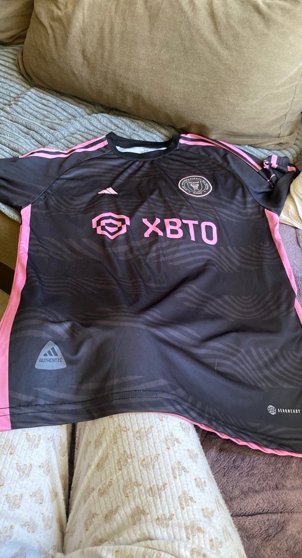 Dar kesim, kısa kollu, yuvarlak yakalı detaylı erkek spor tişörtü. Sentetik kumaştan üretilmiş, pembe ve siyah baskılı, XBTO logolu.Messı