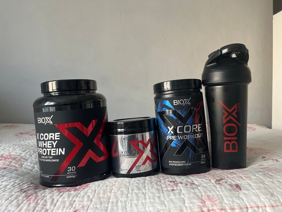 XCORE Preworkout siyah toz, 34 servis içerir ve antrenmanlarınızı destekler. Performans artırıcı kreatin takviyesi ile birlikte. ️