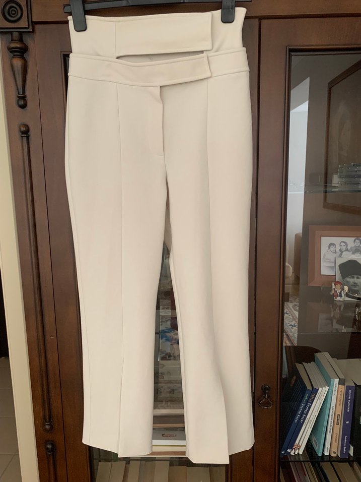 Yüksek bel kullanmak istemeyen çıkarabilir normal bel olarak kullanabilir. Sorunsuz ve temizdir. Boy ekstra yüksel bel ile 91/83 cm, normal bel hali 37 cm, basen 42/43 cm dir. Ekstra yüksel bel ve yırtmaç detaylıdır. Krem renk.