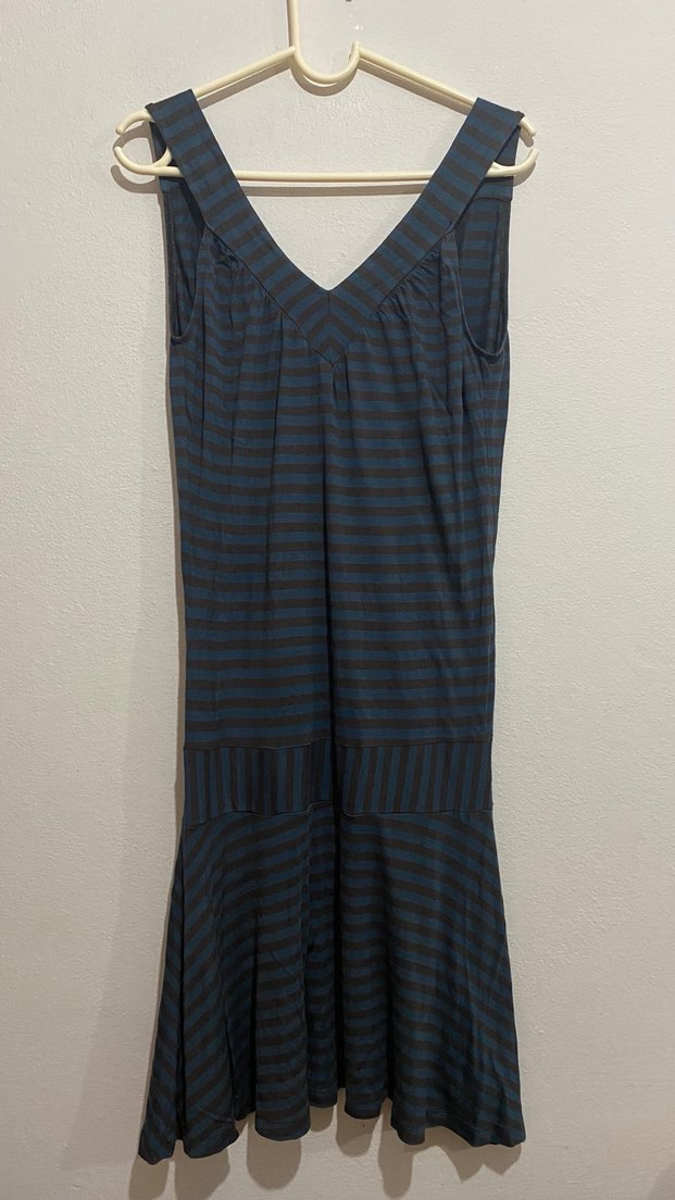 XDYE marka, V yaka, askılı ve sırt dekolteli elbise, çizgili ve pile detaylı, bol kesim, vintage sokak stili için uygun. Askı dikiş yerinde çok minik bir ek dikiş var, fotoğrafını ekledim.