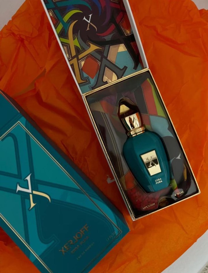 Xerjoff kadın parfümü, altın detaylı turkuaz şişede, renkli ve sanatsal kutusunda sunuluyor.