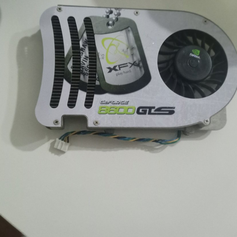 XFX GeForce 8600 GTS ekran kartı, soğutma fanı ve havalandırma delikleri ile gri ve yeşil renklerde bilgisayar bileşenidir.