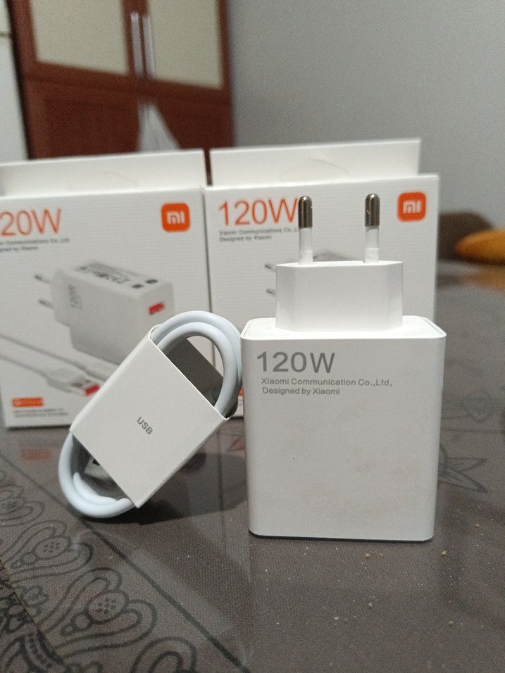 Xiaomi 120W hızlı şarj cihazı, beyaz ve gri renkte, USB kablo ile birlikte gelir. ⚡