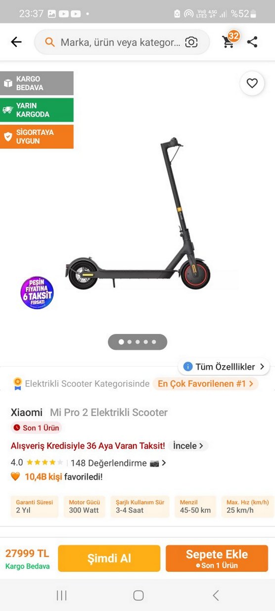 İhtiyaçtan dolayı acil satılıktır. Xiaomi Mi Pro 2 siyah renkli elektrikli scooter, Marka: Xiaomi Ürün adı: Mi Electric Scooter Pro 2 Ürün kodu: FBC4025GL EAN/UPC kodu: 6934177715761 Klasik skooter Katlanır Siyah Motor pozisyonu: Ön tekerlek Fırçasız 300 W 25 km/h 2 tekerlek(ler) Lityum-İyon (Li-Ion) 12,8 Ah Dahili ekran LCD Ön fren sistemi: Elektrik Arka fren sistemi: Disk freni Tavsiye edilen cinsiyet: Unisex Maksimum yük ağırlığı: 100