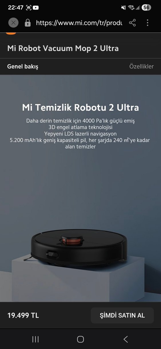 Xiaomi Mi Robot Vacuum Mop 2 Ultra Akıllı Robot Süpürge 4000 Pa güçlü emiş - Toz, kırıntı ve evcil hayvan tüylerinde yüksek performans LDS lazer navigasyon + 3D engel algılama - Akıllı haritalama, çarpmadan temizlik Süpürme + paspas - Aynı anda kuru ve ıslak temizlik 5200 mAh batarya - Tek şarjda geniş alan temizliği Mi Home uygulama desteği - Oda seçimi, zamanlama ve harita yönetimi Wi-Fi kontrollü Halı & sert zemin uyumlu Uzun pil ömrü Temiz, bakımlı ve sorunsuzdur. Ciddi alıcılar yazabilir.