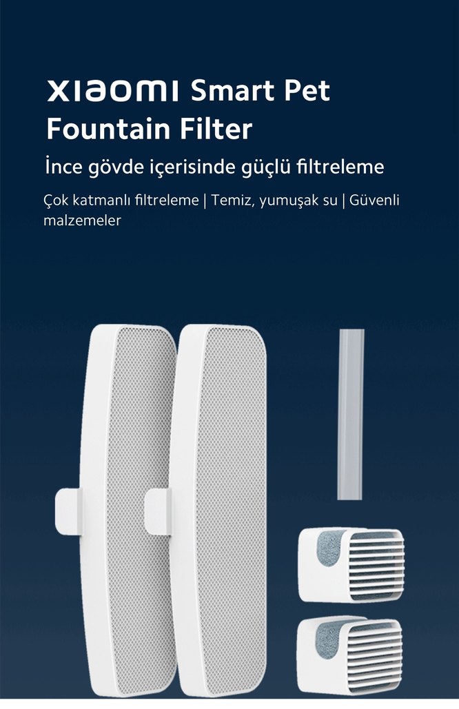 Xiaomi Smart Pet Fountain Filtre, ince gövde içinde çok katmanlı güçlü filtreleme ile temiz ve yumuşak su sunar, güvenli malzemeler kullanır.