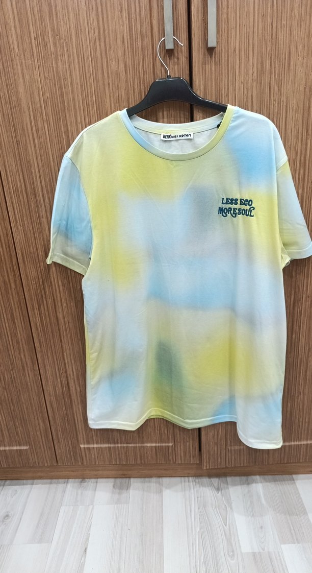 XL beden Pamuk kumaştan erkek tişört, pastel renkli tie-dye desenli, bol kesim ve yuvarlak yaka. Kısa kollu, günlük rahat stil, "MORESOUL" ve "LESSEGO" yazılı detaylarla şık ve rahat.