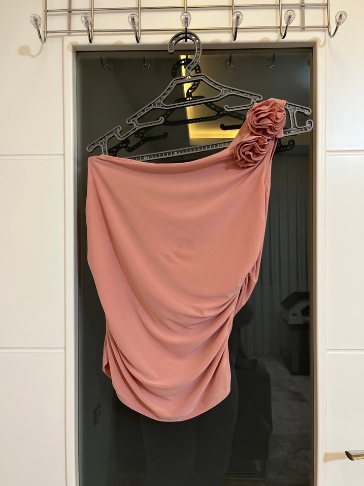 Drapeli ve straplez yaka, çiçek detaylı pembe bluz. Yumuşak kumaştan, kolu yok, normal uzunlukta normal günde kullanılabilir 40 42 44 46 bedene rahatlıkla olur çok ligralı etiketlidir