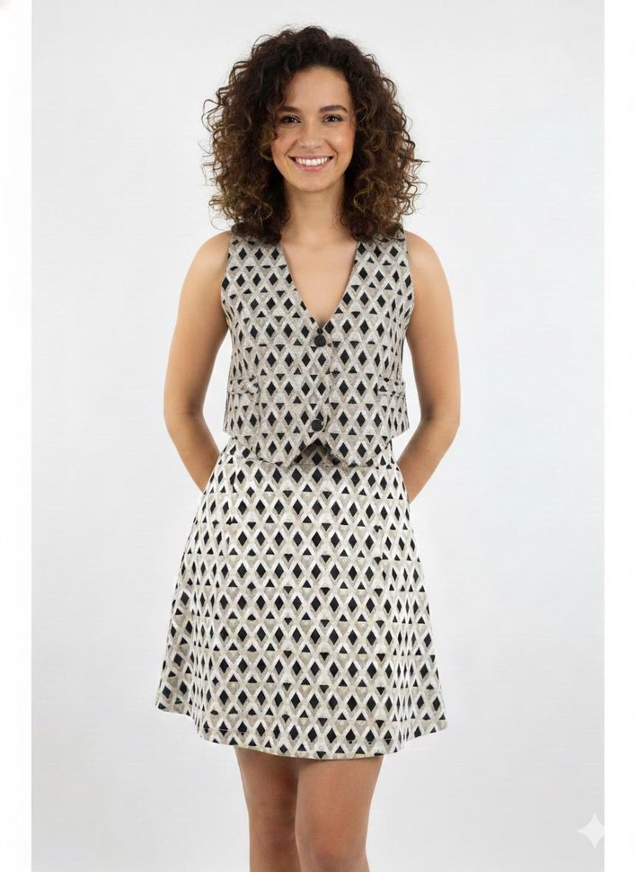 42 XL beden Düğmeli, V yaka ve baskılı desene sahip bej ve gri tonlarında, vücuda oturan kadın yeleği. Kolsuz ve midi boy, sokak stili için uygun.