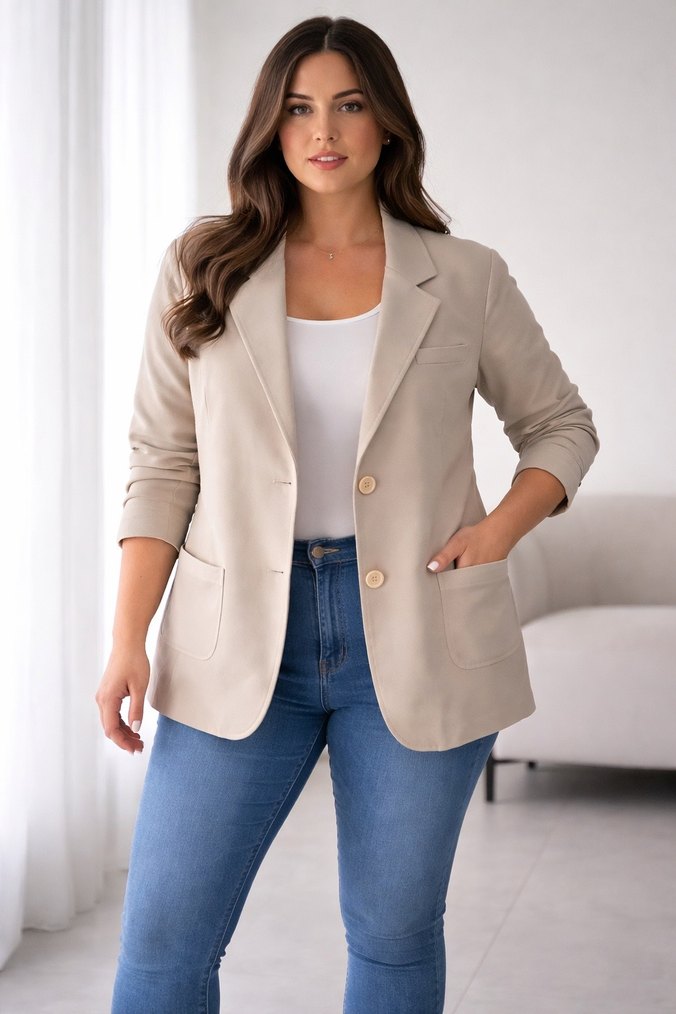 Yumuşak dokulu, basic tarza yakın bu bej blazer; günlük kombinler için konforlu ve zarif bir tamamlayıcı. XL bedene uygundur. Kol altından en: 60 cm | Boy: 67 cm | Kol boyu: 63 cm Az kullanılmıştır, yeni gibidir. ⚠️ Ürünlerim farklı şehirlerden kargolanmaktadır. Lütfen danışmadan ürün birleştirme, toplu alışveriş yapmayınız.