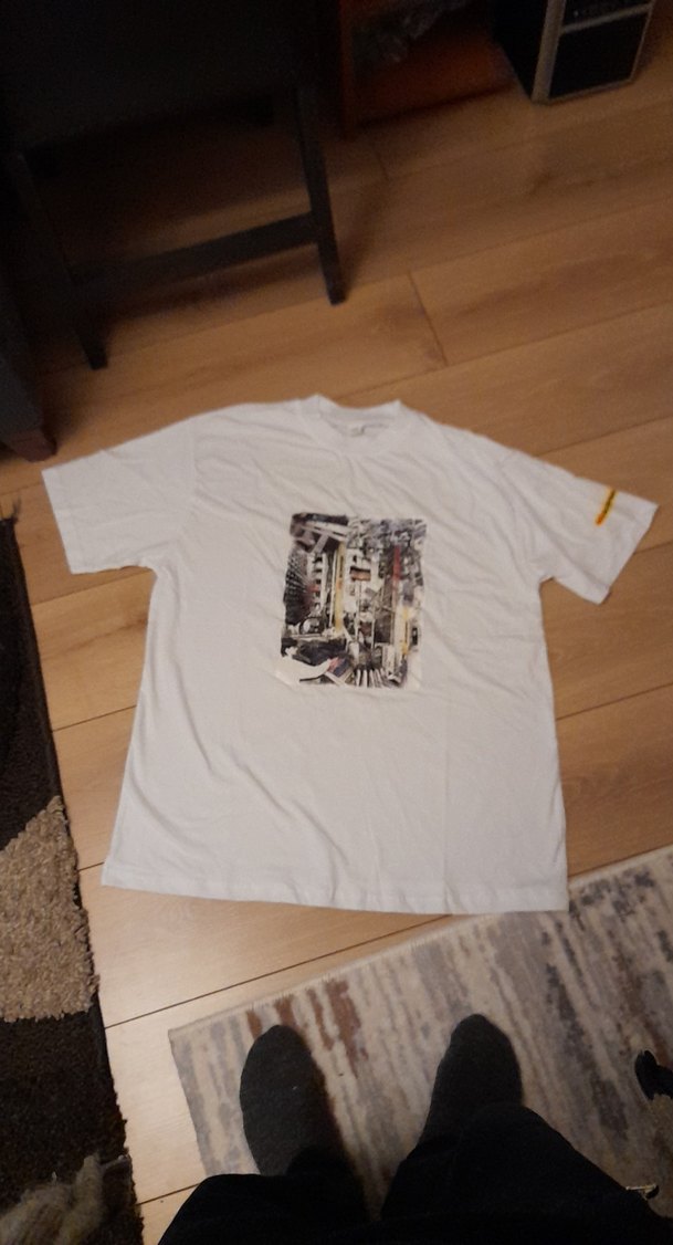 XL Beyaz pamuklu, kısa kollu, bol kesim erkek tişörtü. Ön kısmında baskılı tasarım ve yuvarlak yaka bulunur. Günlük sokak stili için uygundur.