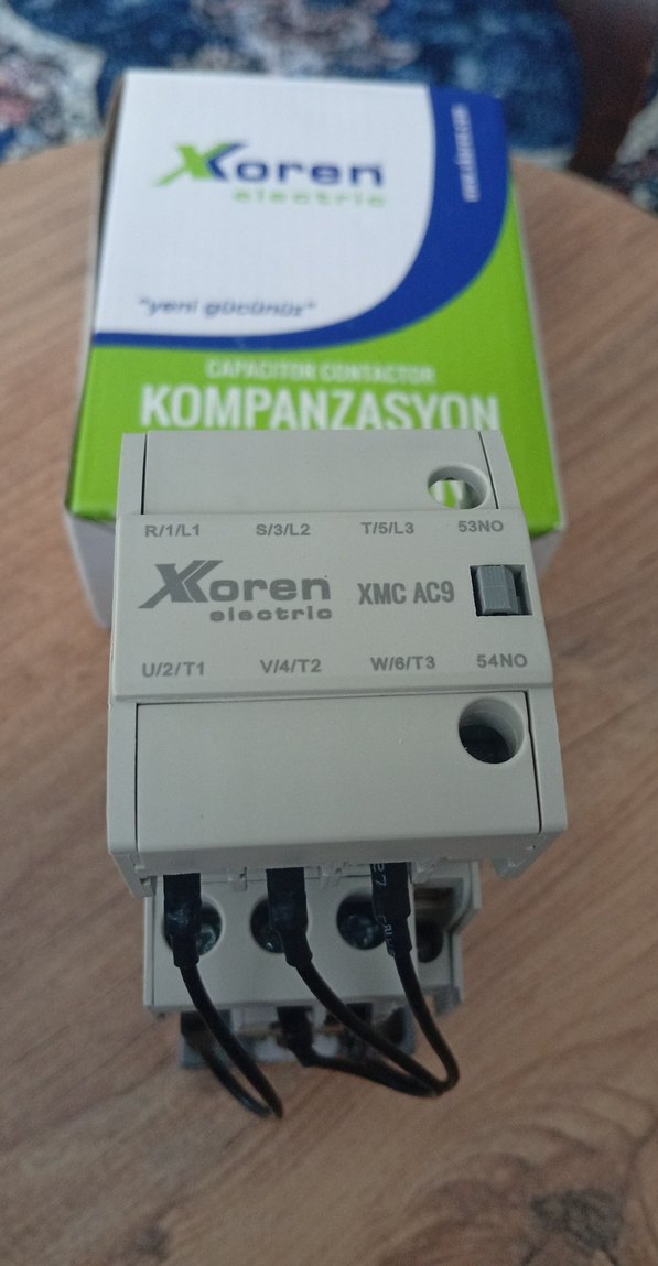 Xoren Electric KOMPANZASYON kontaktör, kolay bağlantı için etiketli terminallere sahiptir. Beyaz ve gri renkte, net işaretlemelidir. ⚡
