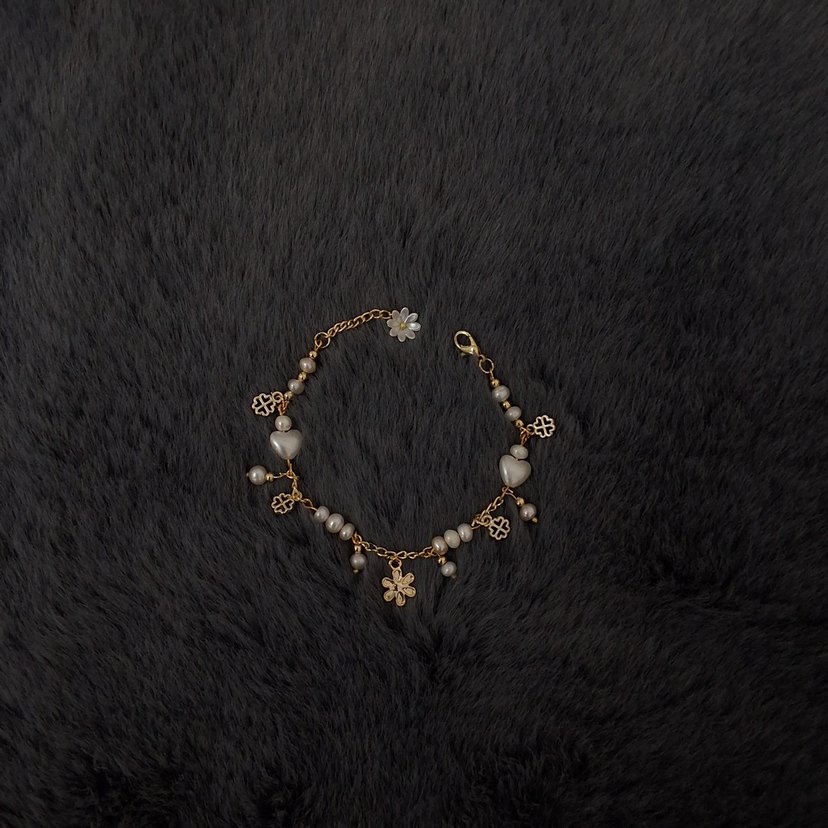 İşlemeli desenli, gri boncuklar ve altın süslemelerle bezenmiş, gotik ve bohem tarzı yansıtan bileklik.