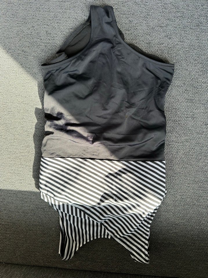 Gri renkte, yüksek yakalı ve kolsuz, vücuda oturan mayo Normal boyda ve rahat hareket imkanı sunar. Ust kısmı çizgili desende. Yurtdisindan almistim
