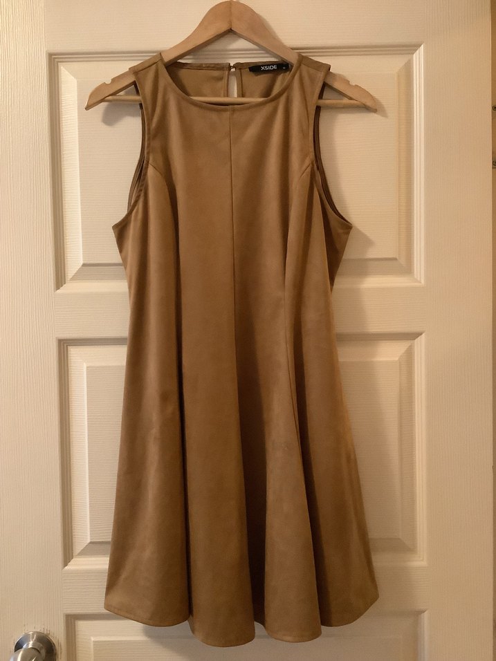 Bej süet midi elbise, fitted kesim ve kolsuz tasarıma sahiptir. Parlak yüzeyli, ofis için uygun sade ve şık bir stildir. Sadece iki kez giyildi.