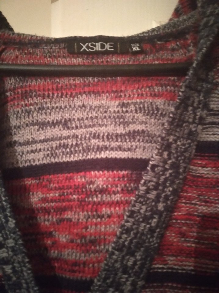 XSIDE marka, çok renkli desenli, gri tonlarında, V yakalı, uzun kollu, bol kesim hamile hırkası. Rahat ve günlük kullanıma uygun.