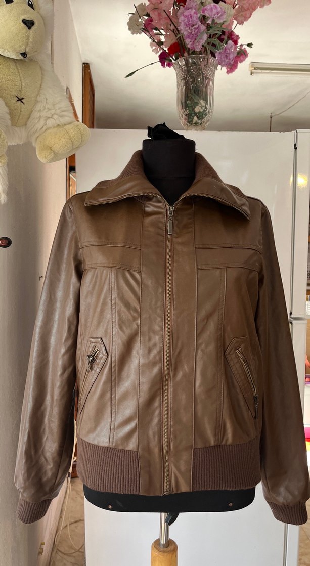Kahverengi deri biker ceket, kesik yaka, uzun kollu ve kemerli. Parlak görünümlü, normal kesim, günlük kullanım için uygun. Boy 58 en 49