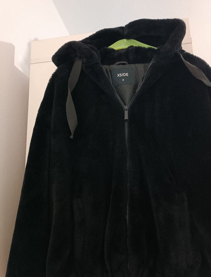 XSIDE markalı siyah kapüşonlu kadın peluş mont, bol kesim ve kürk detaylıdır. Günlük kullanıma uygun rahat ve sokak tarzı bir üründür. Az kullanılmıştır. S-M uyumludur.