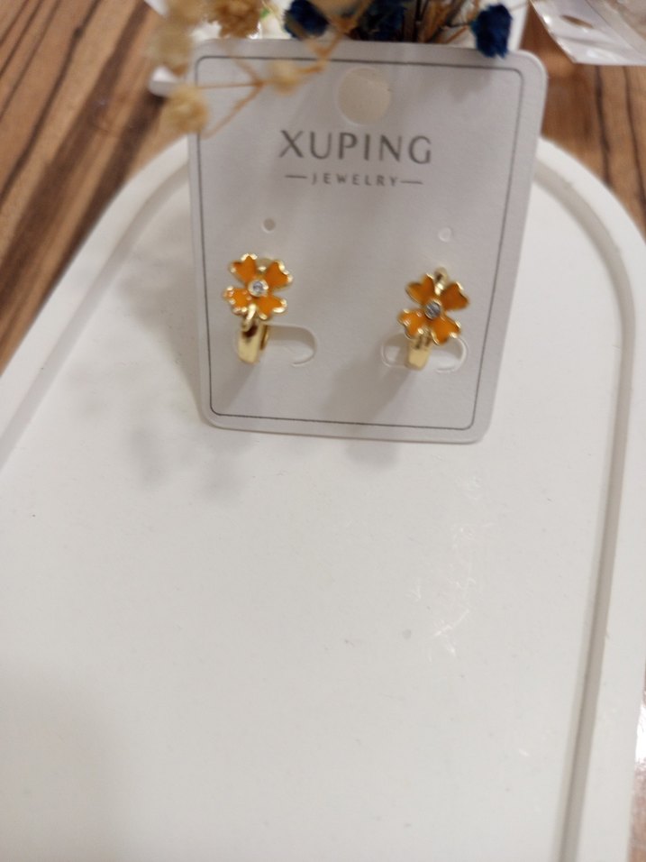 Xuping markalı, altın renkli, mini uzunlukta çiçek desenli ve boncuklu detaylara sahip günlük kullanıma uygun küpe.