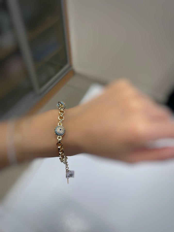 Günlük kullanıma uygun, zincir detaylı ve nazar boncuklu altın renkli modern bileklik.