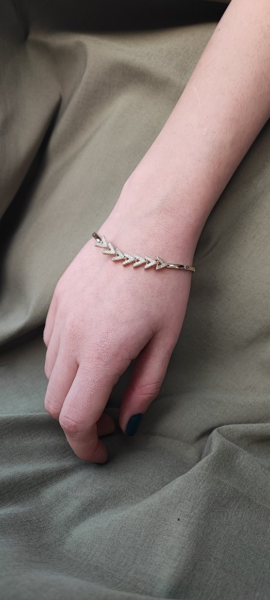 Altın renginde, zincir detaylı ve hafif yılan deseni bulunan bileklik, günlük kullanıma uygun minimalist ve çağdaş bir tasarıma sahiptir.