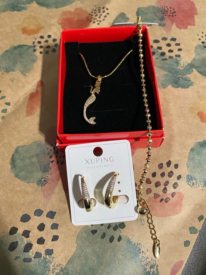 Xuping markalı, zincir detaylı altın renkli kadın takı, küpe ve kolye ve bileklik içerir.