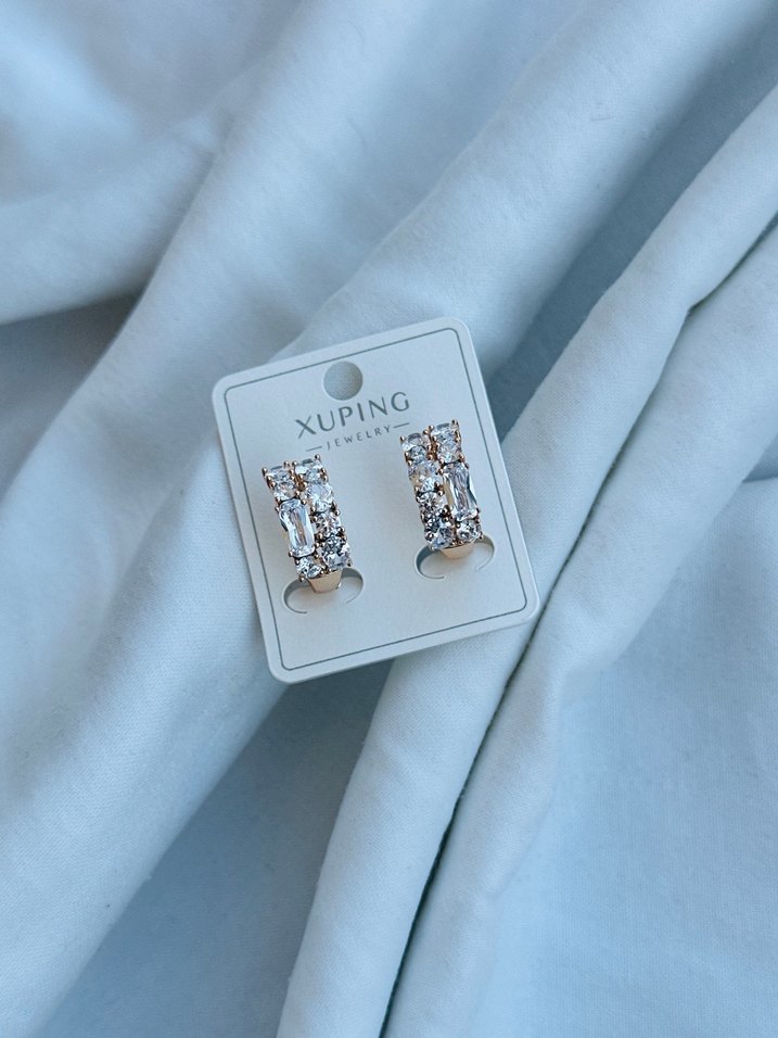 Xuping markalı, beyaz payetli, kısa mini uzunlukta, minimalist desenli çağdaş tasarıma sahip küpeler. Düğün ve klasik zarafet için uygun.