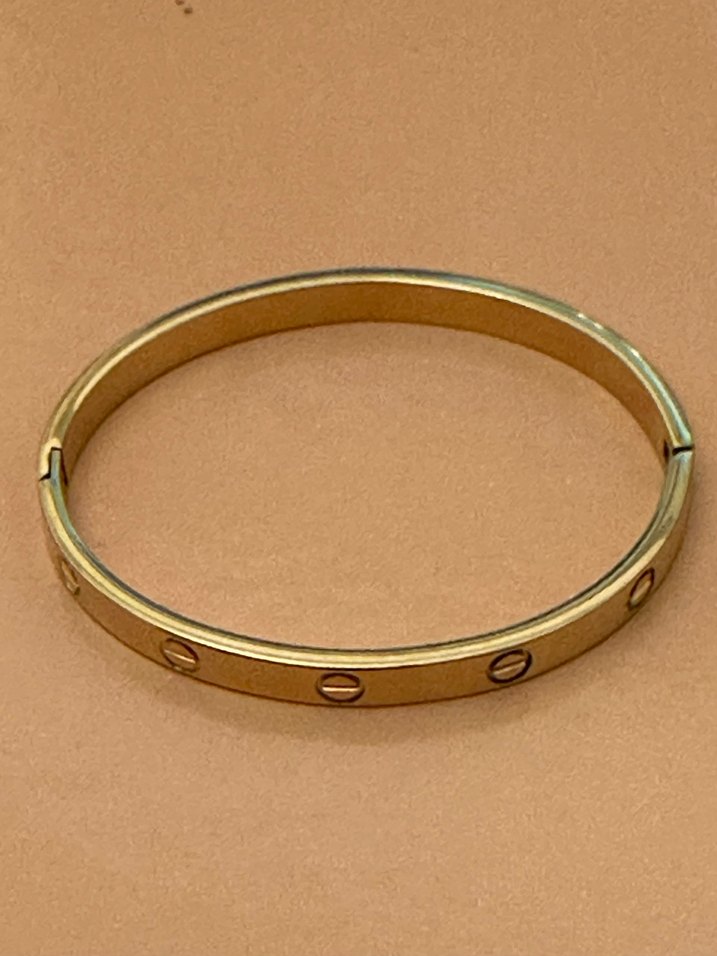 Parlak altın renkli, minimalist tasarımlı kelepçe bileklik.