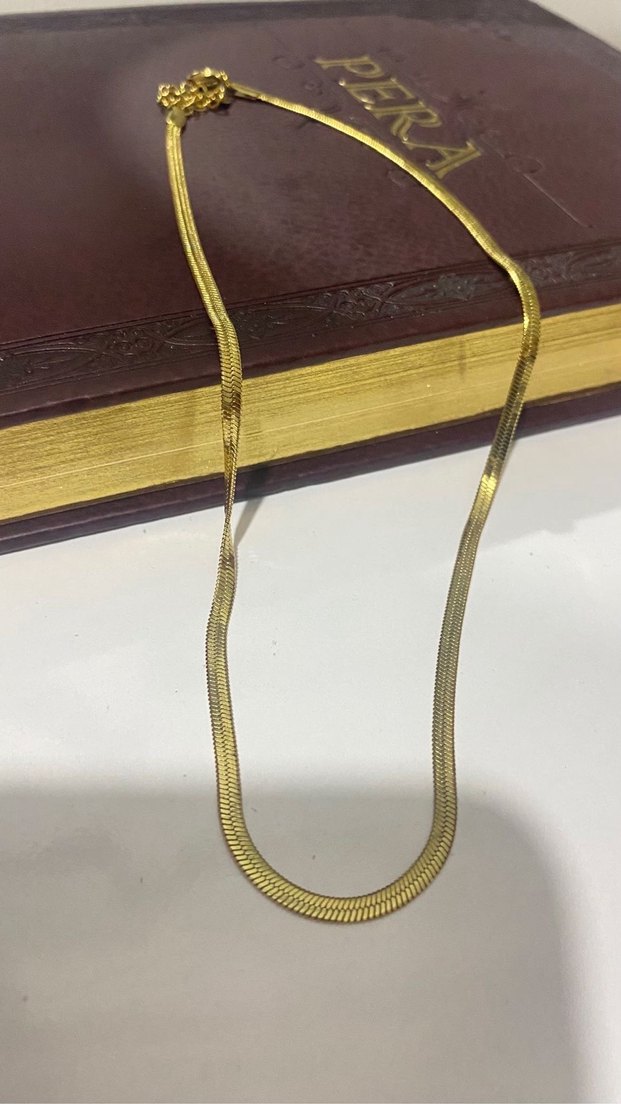 Uzun, parlak altın renkli kolye yılan deseni ve zincir detayına sahip, çağdaş ve minimalist tasarımıyla günlük kullanıma uygundur.