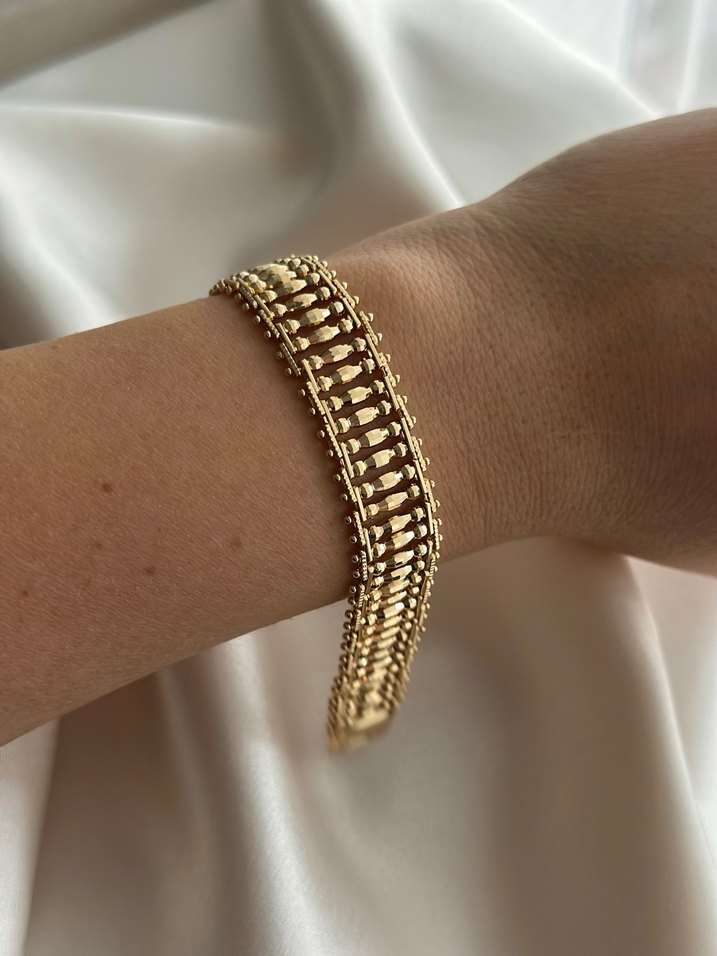 Parizyen zarafetinden ilham alan, zincir detaylı altın renkli modern klasik kadın bileklik.