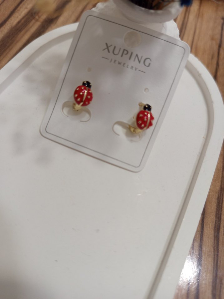 Xuping markalı kısa, renkli kırmızı küpeler, boncuklu uğur böceği deseniyle minimalist bir tarz sunar.