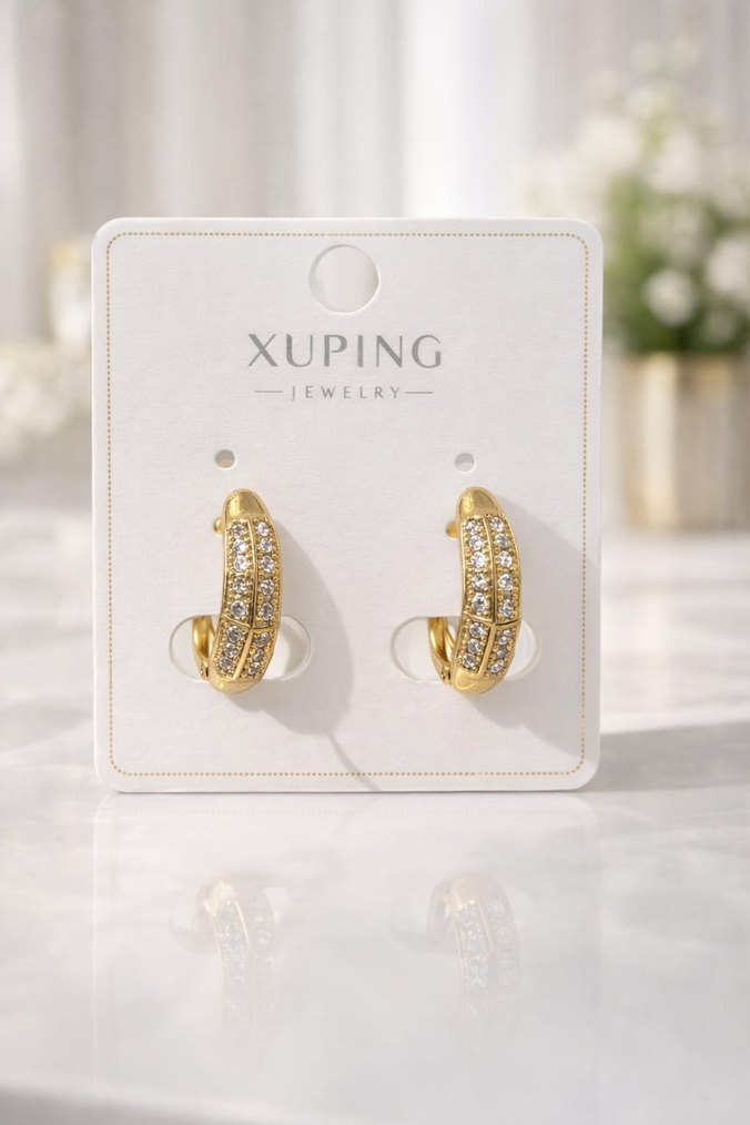 Xuping Jewelry markalı, parlak taşlarla süslenmiş mini altın renkli küpeler. Modern klasik stilde, düğün ve özel günler için uygun.