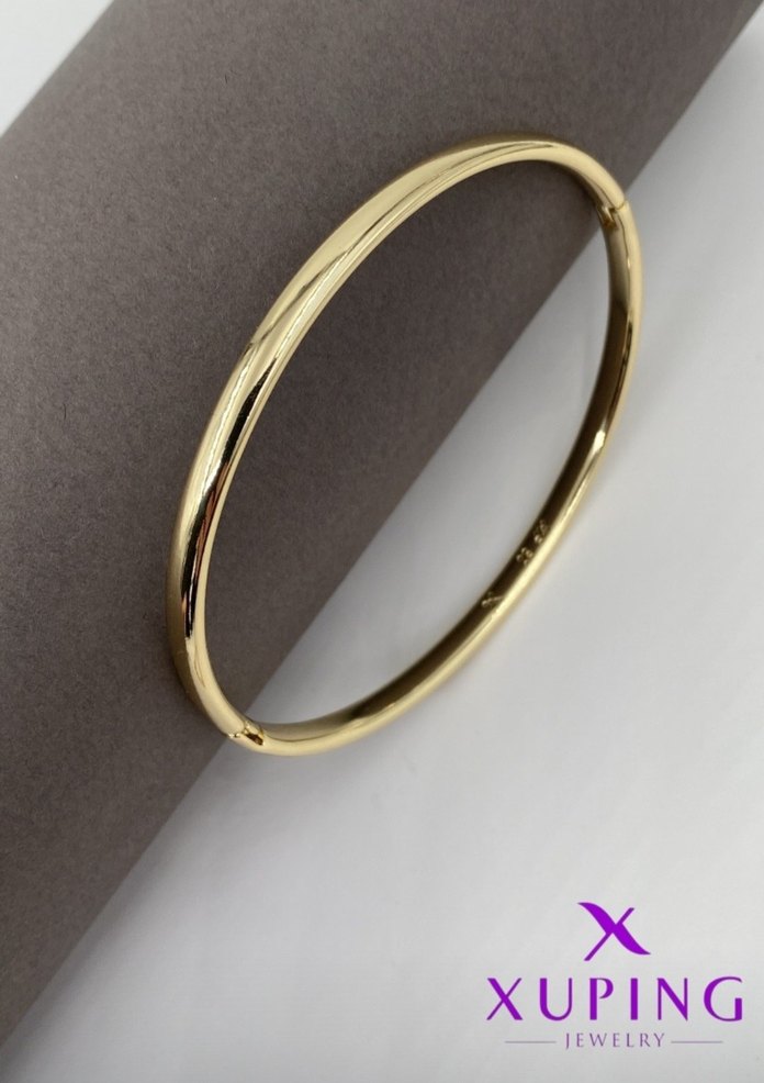 Xuping markalı, parlak altın renkli bileklik. Minimalist ve desen içermeyen tasarımıyla klasik ve çağdaş şıklığa uyum sağlar. Düğünler için ideal.