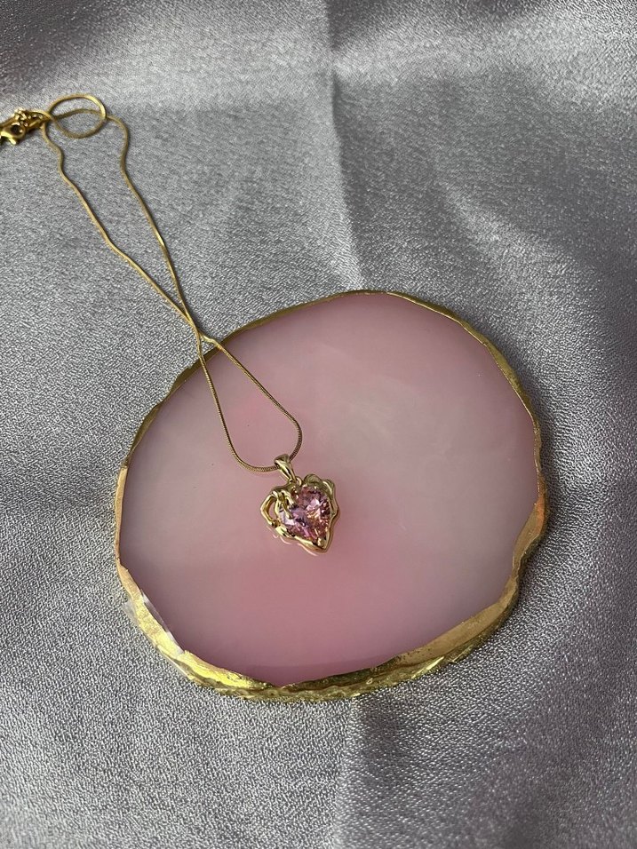 Altın rengi zincir detaylı, pastel pembe taşlı kalp kolye. Midi uzunlukta, bohem tarzda ve klasik zarafette, romantik akşamlar için uygun.