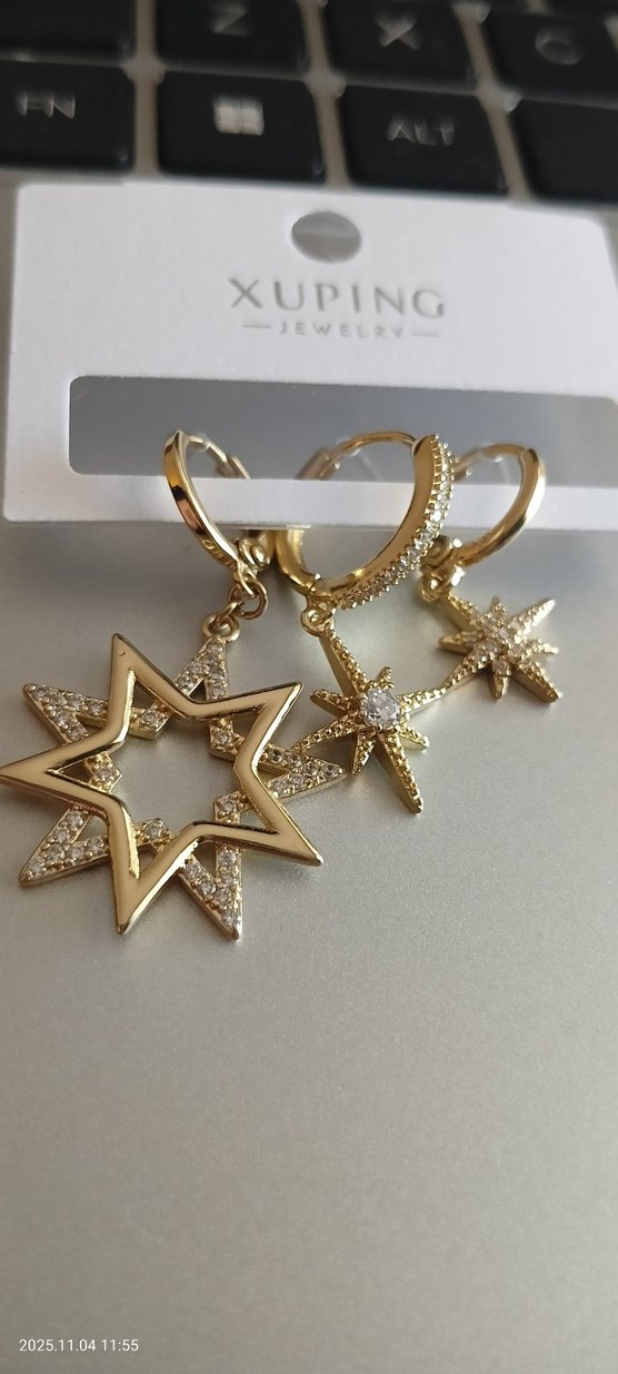 Xuping markasının mini, parlak altın işleme detaylı, payetli yıldız figürlü küpeleri romantik akşamlar için uygun, bohem tarzda.