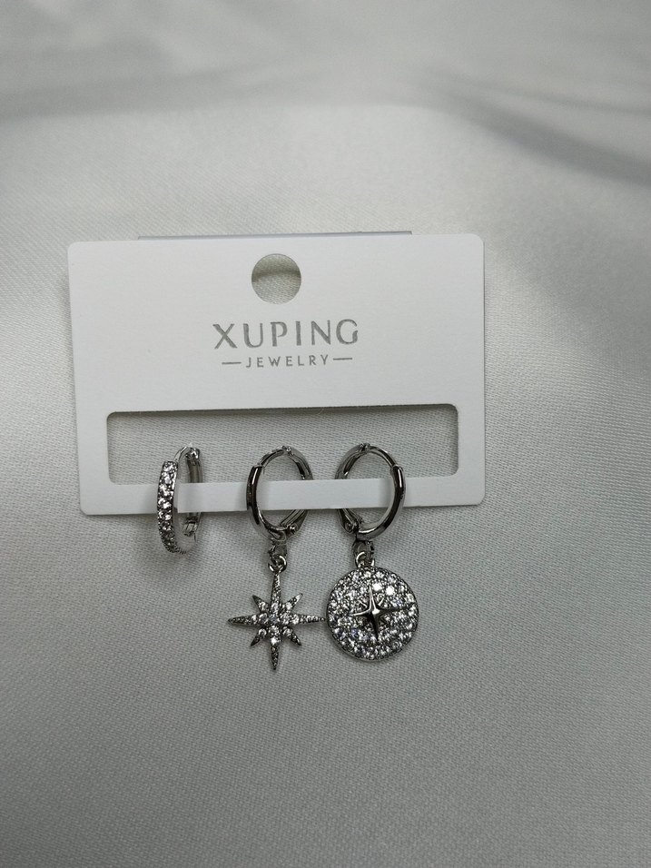 Xuping markalı mini küpe seti, beyaz ve gri tonlarda taşlı, yıldız ve yuvarlak desenli detaylara sahip. Minimalist rock punk tarz, günlük kullanıma uygun. ✨