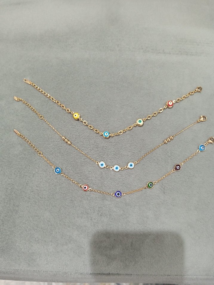 Zincir detaylı, üç mavi nazar boncuğu bulunan rose gold rengi kadın bileklik, günlük sokak stiline uygun minimal ve bohem tarzda. ✨