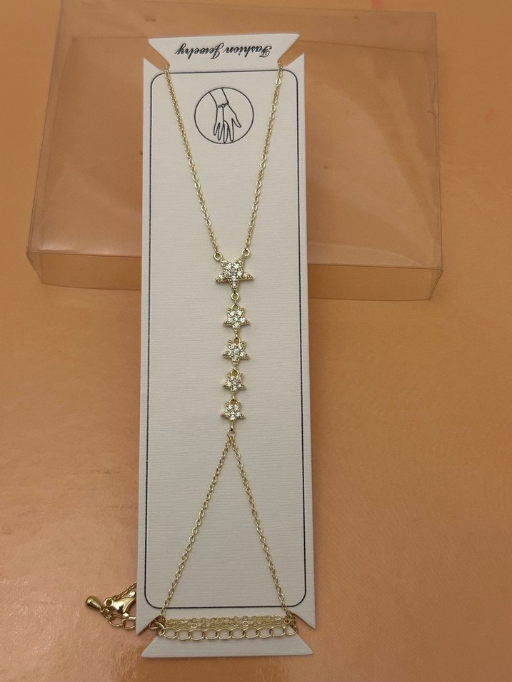 Yıldız detaylı, ince zincirli altın renk kadın el şahmeran bileklik, bohem ve minimalist tarzlar için uygun.