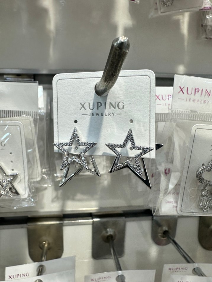 Beyaz, kısa uzunlukta yıldız figürlü ve payetli detaylı Xuping küpeler, romantik gece ve rock punk tarzı için ideal. Markası: Xuping Jewelry. ⭐