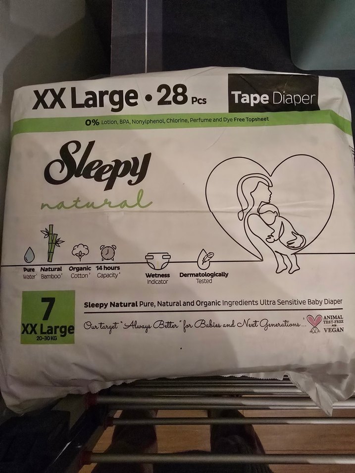 XXL bantlı bebek bezleri, 14 saat kapasiteye sahip doğal ve organik içeriklidir. Losyon, BPA, klorin, parfüm ve boya içermez, ıslaklık göstergesi ve dermatolojik testlidir.