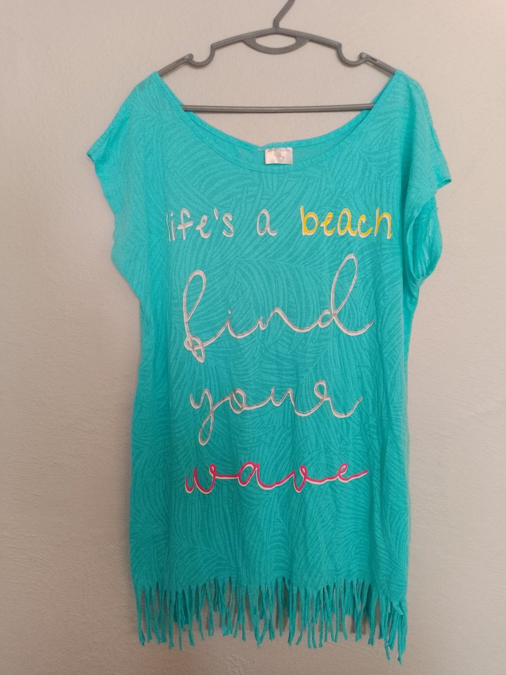( iki koltuk altı arası genişlik 60 cm boy püsküllerle birlikte 84 cm.) Turkuaz renkte, kısa kollu, bol kesim tişört, baskı ve püskül detaylı. Yuvarlak yaka, pastel bohem tarzı plaj tişörtüde diyebiliriz. üzerinde "life's a beach" yazısı bulunur