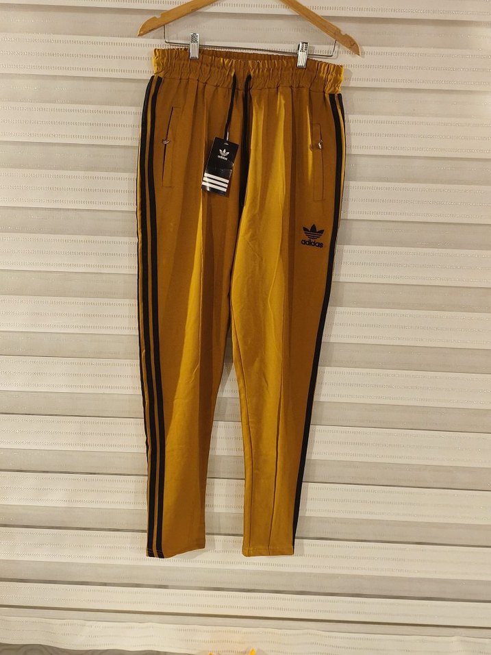 Siyah yan şeritli, fermuarlı cepli, sentetik kumaştan üretilmiş sarı Adidas erkek eşofman altı. Rahat kesim ve midi boy.hardal sarısı xxl beden