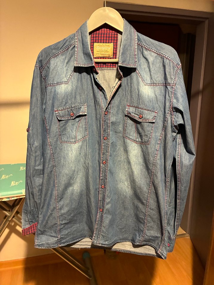 Bu erkek denim gömlek, düğmeli ön, uzun kollu ve kesimli yakaya sahiptir. Mavi ve gri tonlarda batik desenli, günlük rahat kullanım için uygundur. boy önden 70 santim arkadan 77 santim iki koltuk arası 55 santim kol boyu 62 santim kullanılmış temiz defosuz