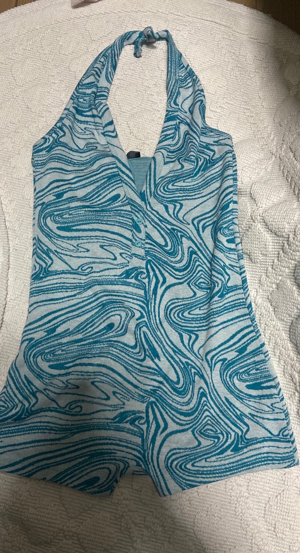 Kolsuz, V yakalı ve drapeli tasarıma sahip bu tulum, penyeden üretilmiştir. Mavi batik deseni ve gri tonlarıyla dış mekan kullanımı için uygundur. Midi boyu ve bohem stili, retro ve hippie havası katar.